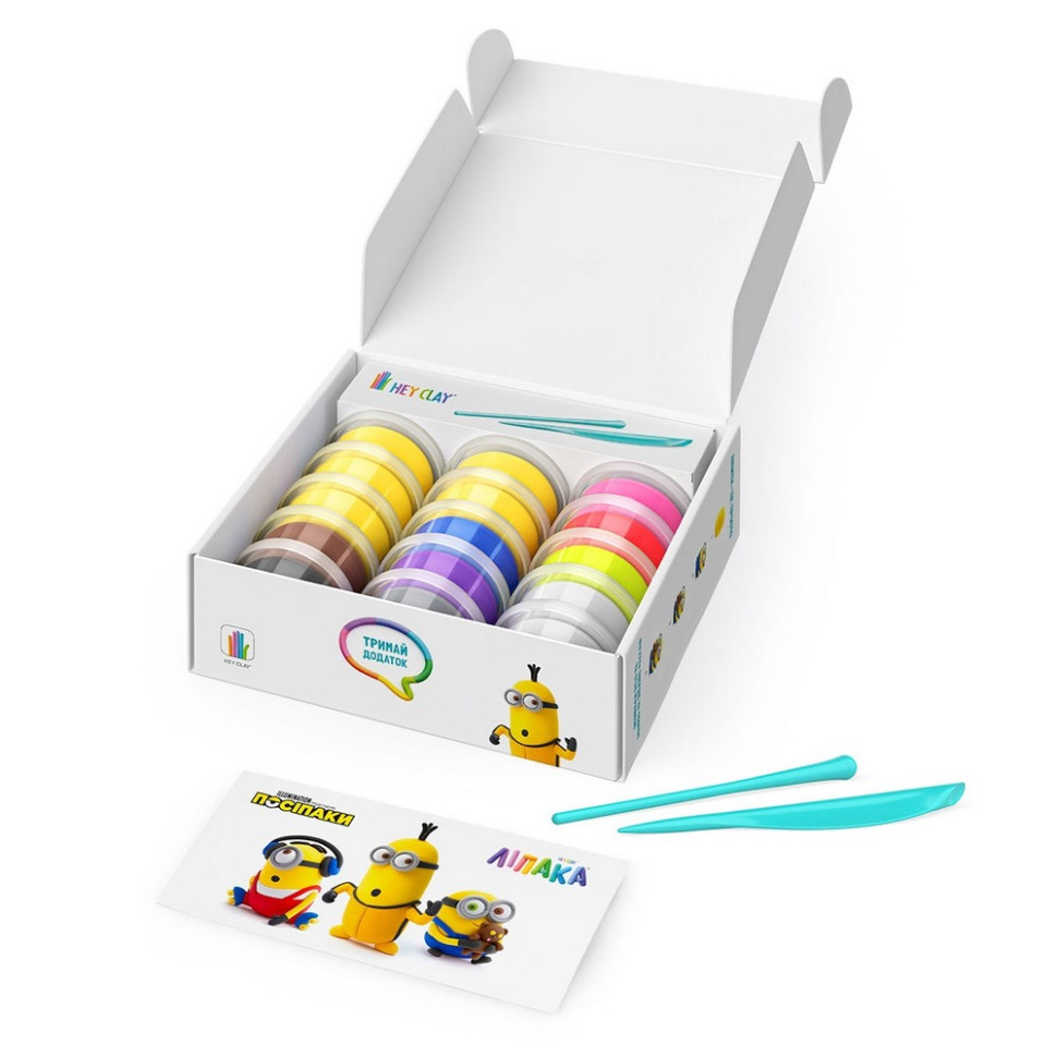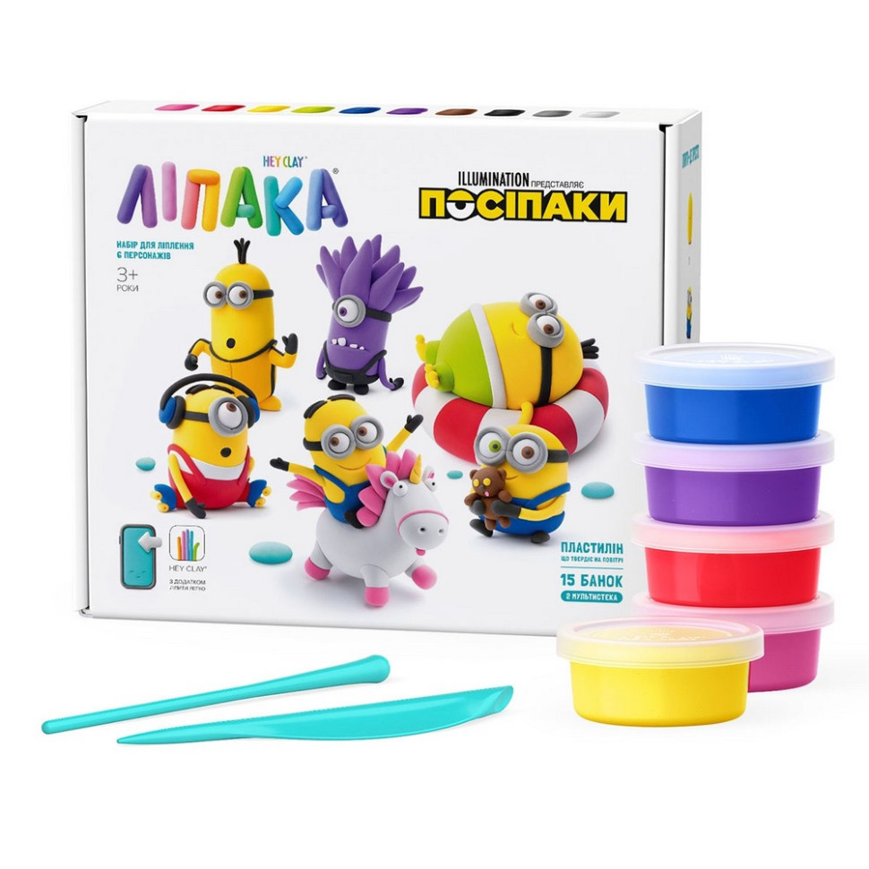 Меганабір пластиліну, що самостійно твердіє, ЛІПАКА – ПОСІПАКИ – розважить і малюків і дорослих. За допомогою анімаційних інструкцій в додатку HEY CLAY, Ви зможете зліпити 6 унікальних персонажів: Кевіна, Отто, Злого міньйона, Стюарта, Дейва з Флаффі та Боба з Тіном. Пластилін твердіє на повітрі протягом 24 годин, після чого можна гратися створеними фігурками.